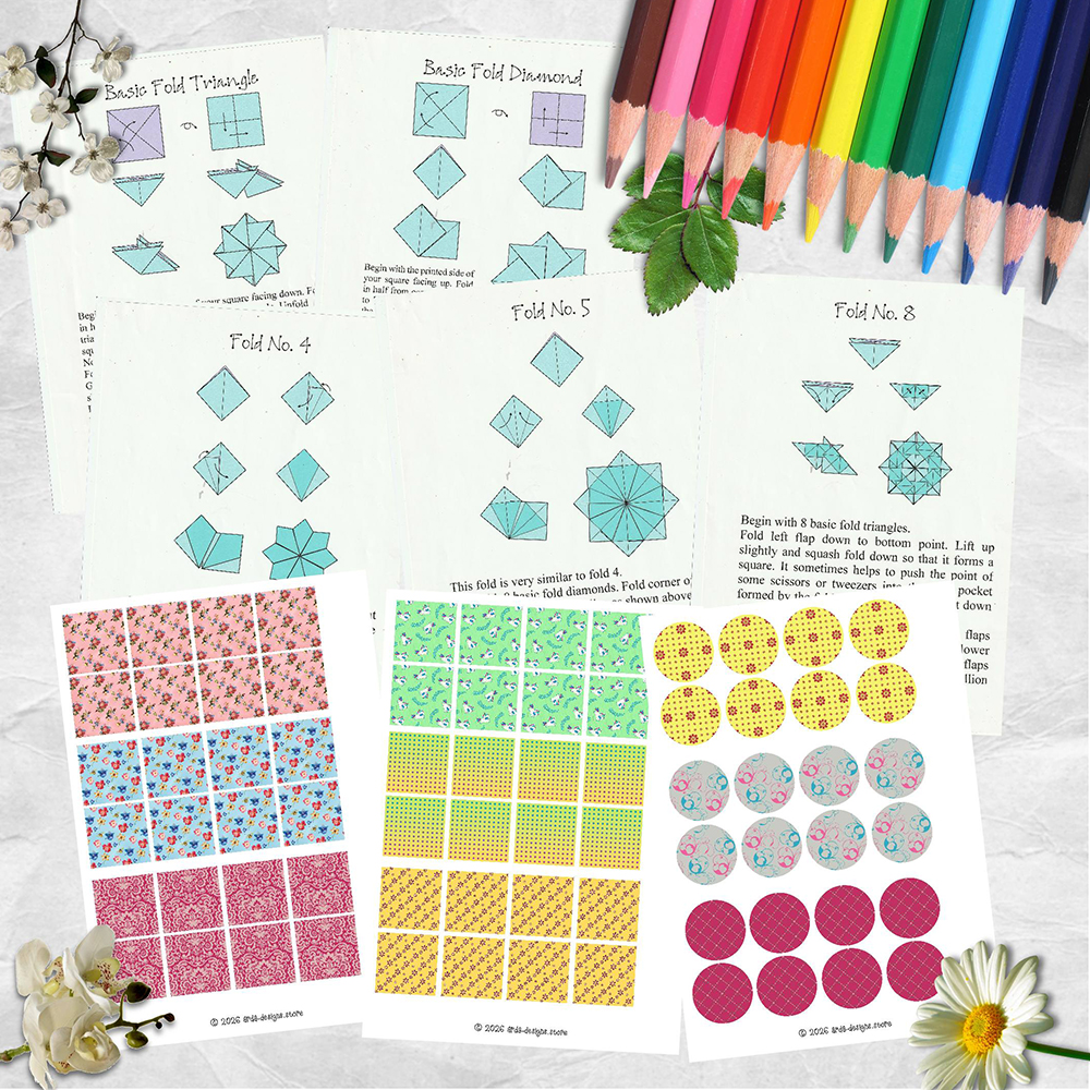In this booklet I show you eight different tea bag folds with diagrams. There are also eight pages of tiles for you to print and use to make cute little rosettes which you use on cards or in journal making.