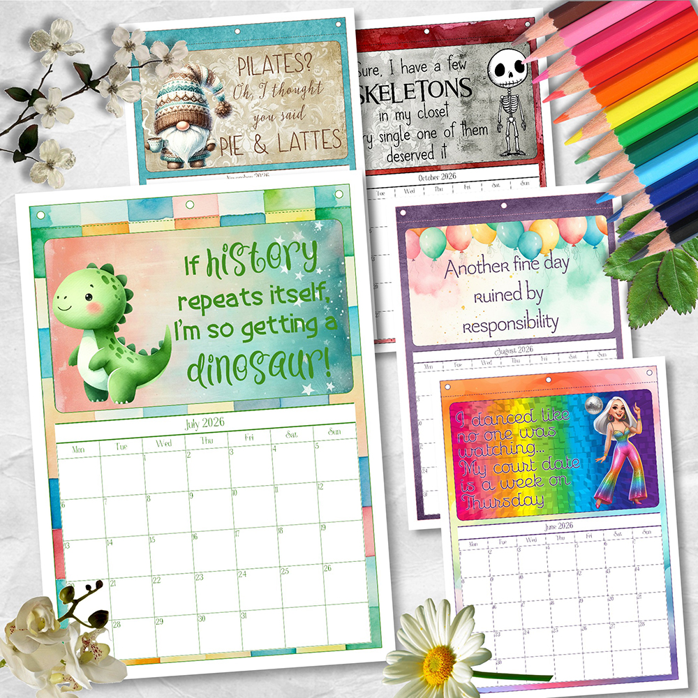 This is the perfect calendar for sarcastic people. With specially curated sarcastic phrases and cute pictures for each month, it’s sure to be a hit, whether as a gift or for yourself. Simply print onto paper (we recommend card for the back panel) and fasten together with split pins through the holes marked. Add a magnetic strip or a loop of ribbon to hang and you’re good to, and all for less than the price of a coffee, so you can afford to treat yourself, although I don’t think you can get that dinosaur yet!