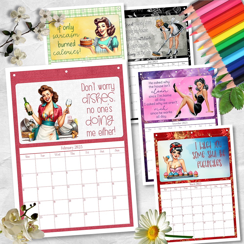 This is the perfect calendar for housewives who are a little bit salty! With specially curated sarcastic and relatable phrases combined with humorous pictures for each month, it’s sure to be a hit, whether as a gift or for yourself. Simply print onto paper (we recommend card for the back panel) and fasten together with split pins through the holes marked. Add a magnetic strip or a loop of ribbon to hang and you’re good to, and all for less than the price of a coffee. So if you are usually stuck at home with just the laundry for company then we think you really do deserve to go out and treat yourself, whether to that fancy coffee or a G and T – whatever works for you!